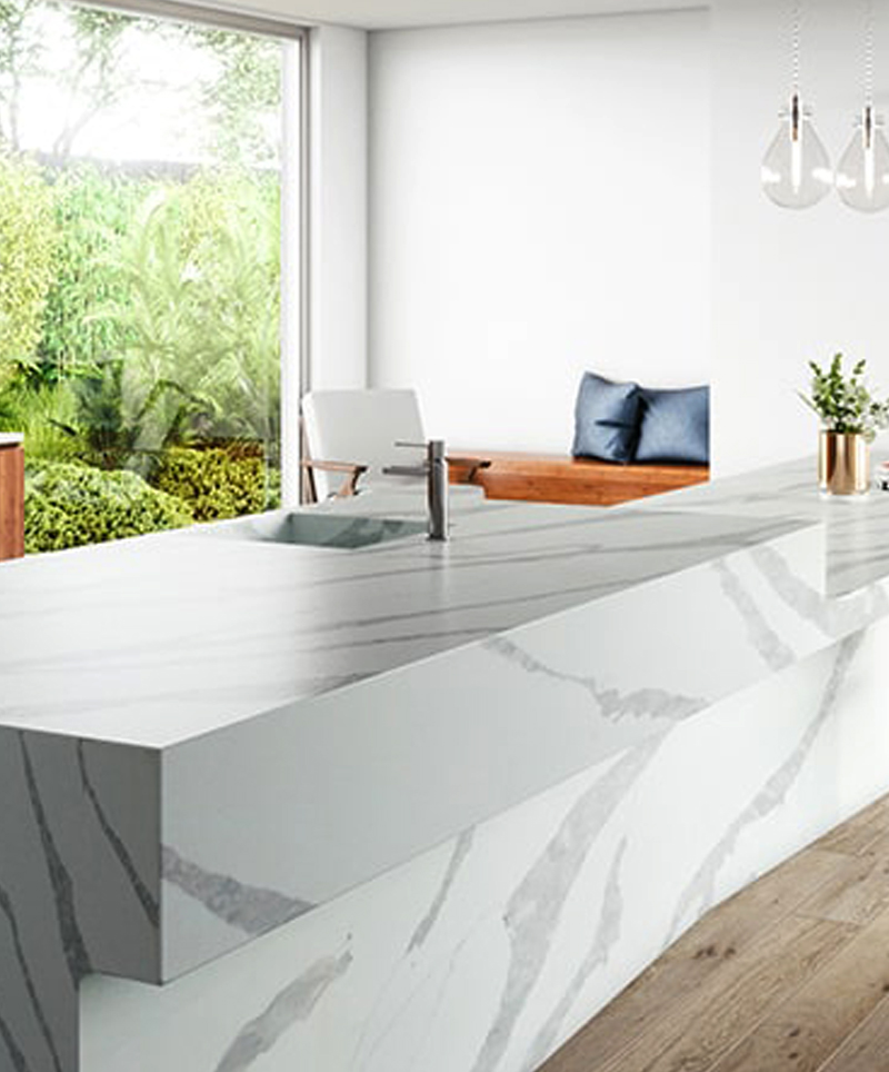 1.Exquisite Aesthetic: The slabs showcase a refined appearance reminiscent of Calacatta marble’s elegance, characterized by bold veining patterns and a pristine white base. This imparts an air of sophistication and luxury to any space.