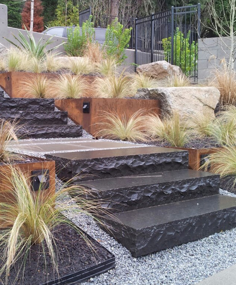 **1. Material Durability:** Basalt is a dense and hard volcanic rock that is well-known for its durability. Using basalt for step risers ensures that they can withstand foot traffic, weather conditions, and other environmental factors.