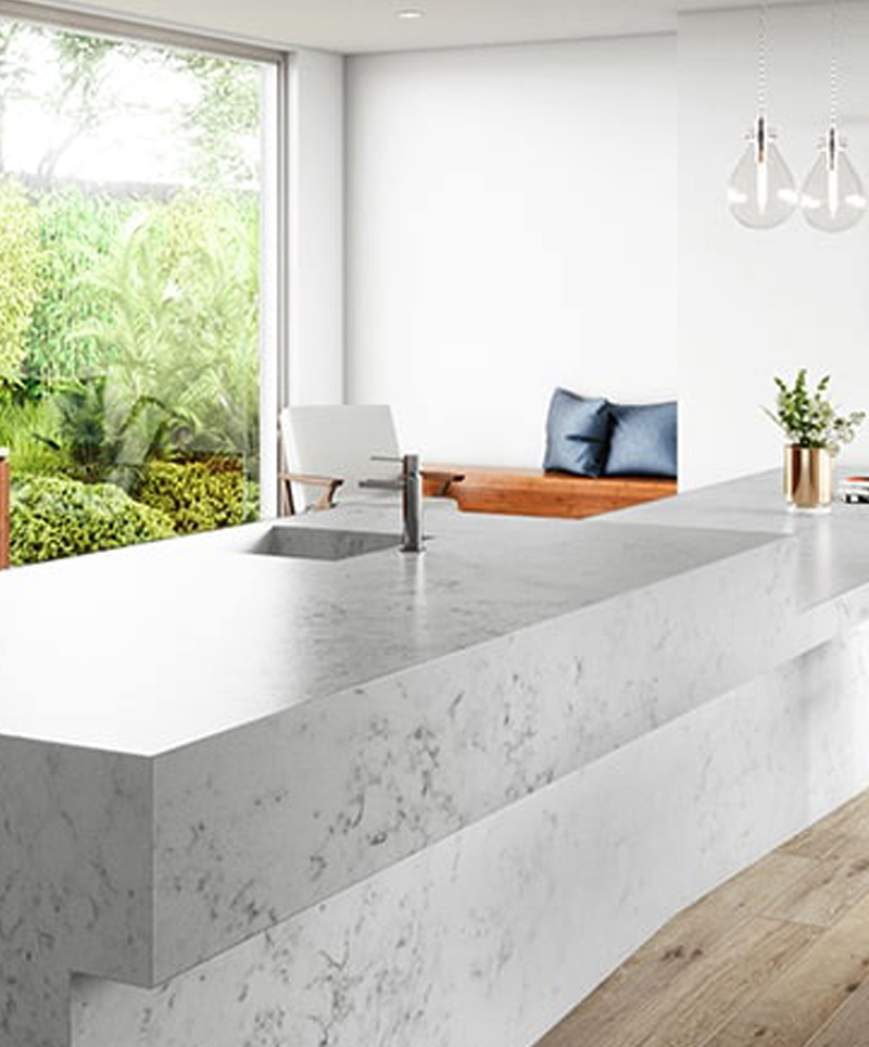 1.Authentic Appearance: The slabs showcase a natural marble-like appearance with delicate veining patterns that mimic the look of Carrara marble, offering a timeless and luxurious aesthetic to any space.